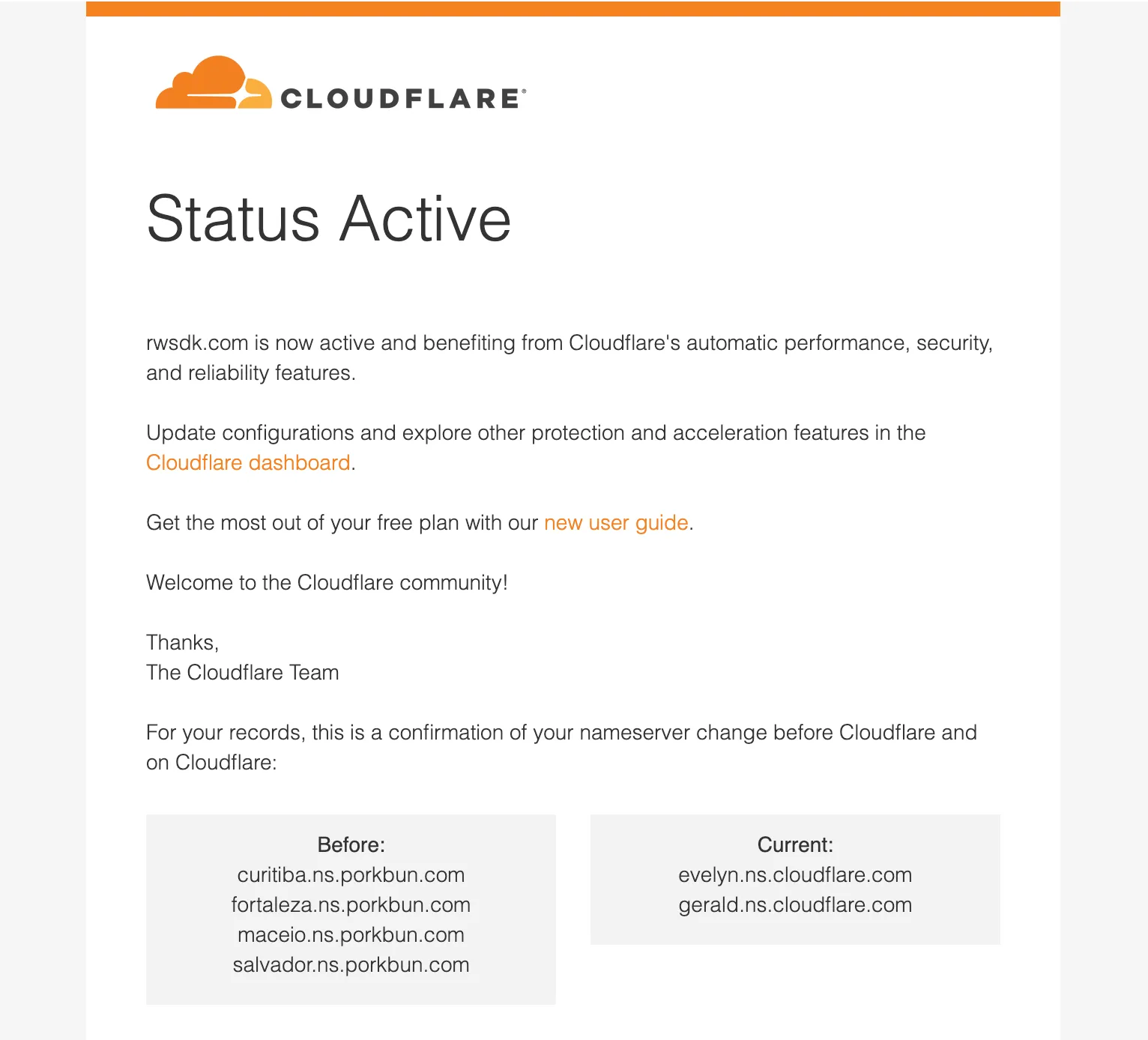 Once Cloudflare has confirmed that your nameservers have been updated, you’ll get an email, and your domain will be added to your Cloudflare account.
