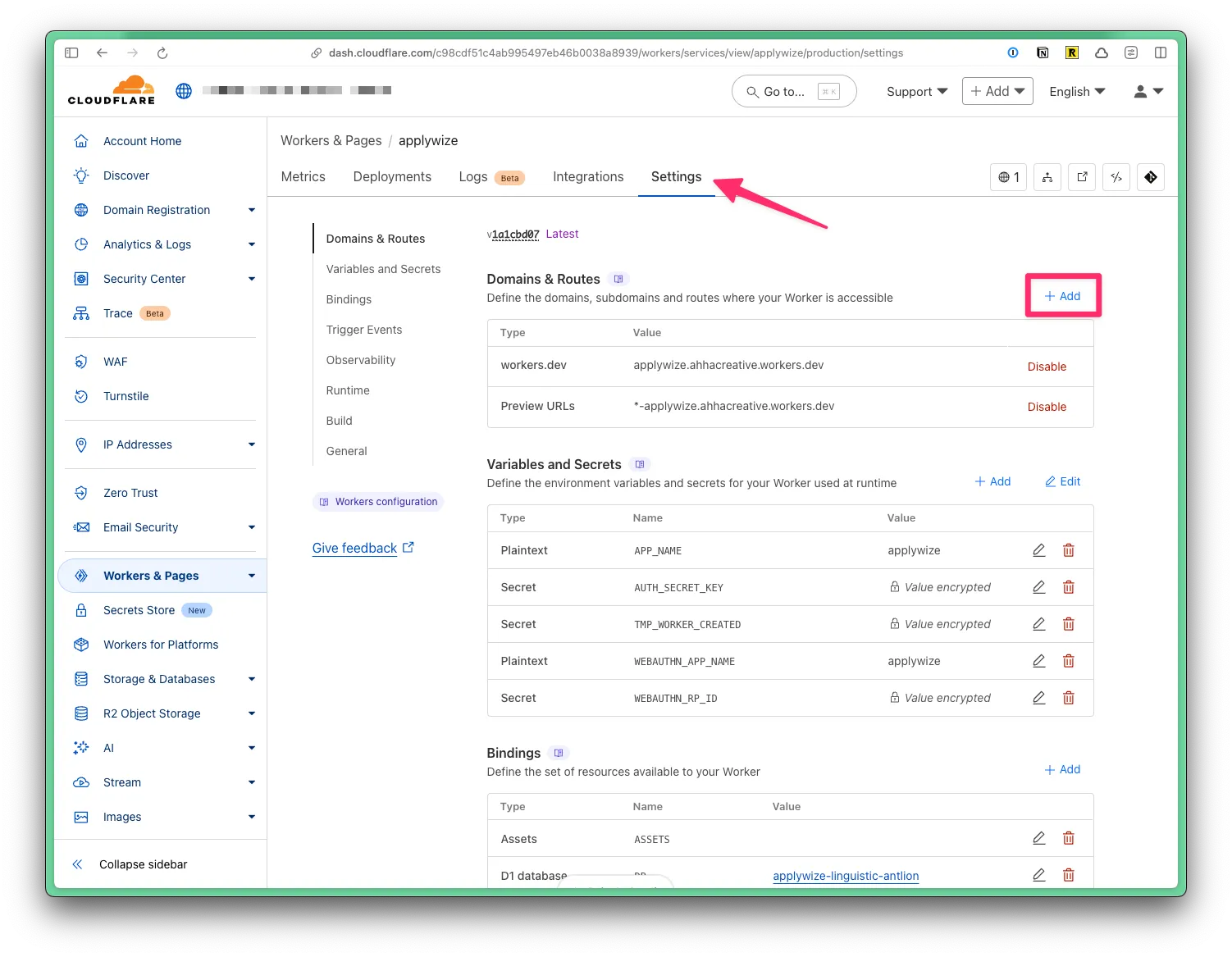To use a domain name that’s registered to your Cloudflare account, go to Workers & Pages in the left side navigation. Then, click on the name of your project. Click on the Settings tab. At the top, you’ll see the domains associated with your project.