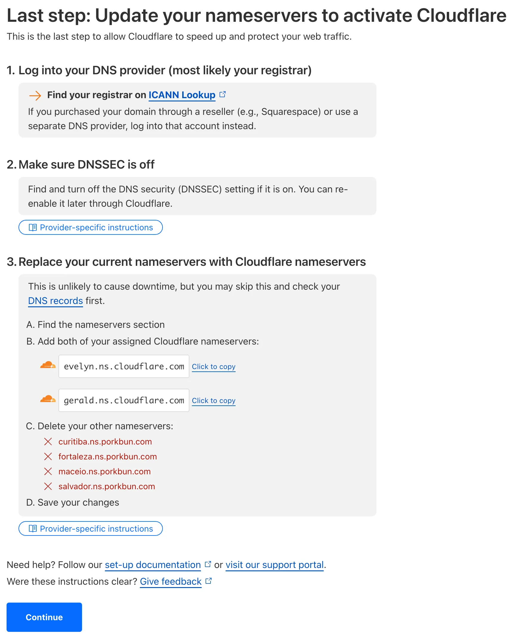 Once you’ve updated your nameservers, go back to Cloudflare and click Continue.